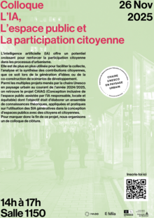 Le 26 novembre prochain se tiendra le colloque de clôture des projets EVADIA+ et CAIAG avec pour thème “L’IA, l’espace public et la participation citoyenne”.