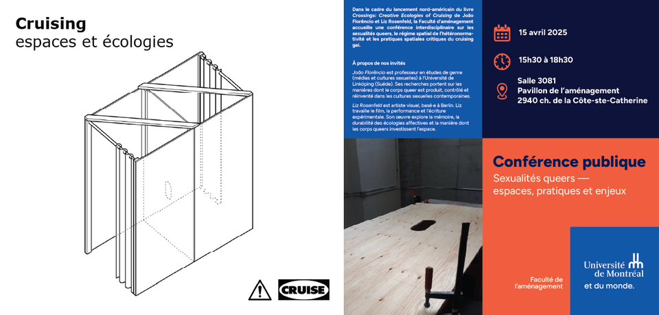 Dans le cadre du lancement nord-américain du livre Crossings: Creative Ecologies of Cruising de João Florêncio et Liz Rosenfeld, la Faculté d’aménagement accueille une conférence interdisciplinaire sur les sexualités queers, le régime spatial de l'hétéronormativité et les pratiques spatiales critiques du cruising gai.