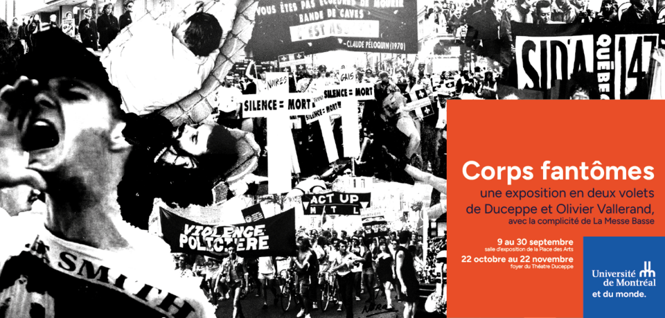 Afin de bien comprendre le contexte de la pièce Corps fantômes présentée du 22 octobre au 22 novembre par La Messe Basse et Duceppe, la salle d’exposition de la Place des Arts et Duceppe accueillent deux expositions conçues par l’équipe du professeur Olivier Vallerand de la Faculté de l’aménagement de l’Université de Montréal. Ancrées dans les riches archives communautaires préservées par les communautés LGBTQ+ ainsi que dans les témoignages de militant·es ayant vécu ces années, ces expositions soulignent l’importance de l’architecture et de la ville dans les réponses à l’épidémie du VIH/sida et l’impact du design et des médias dans le militantisme LGBTQ+ en réaction au sida et à la répression policière.