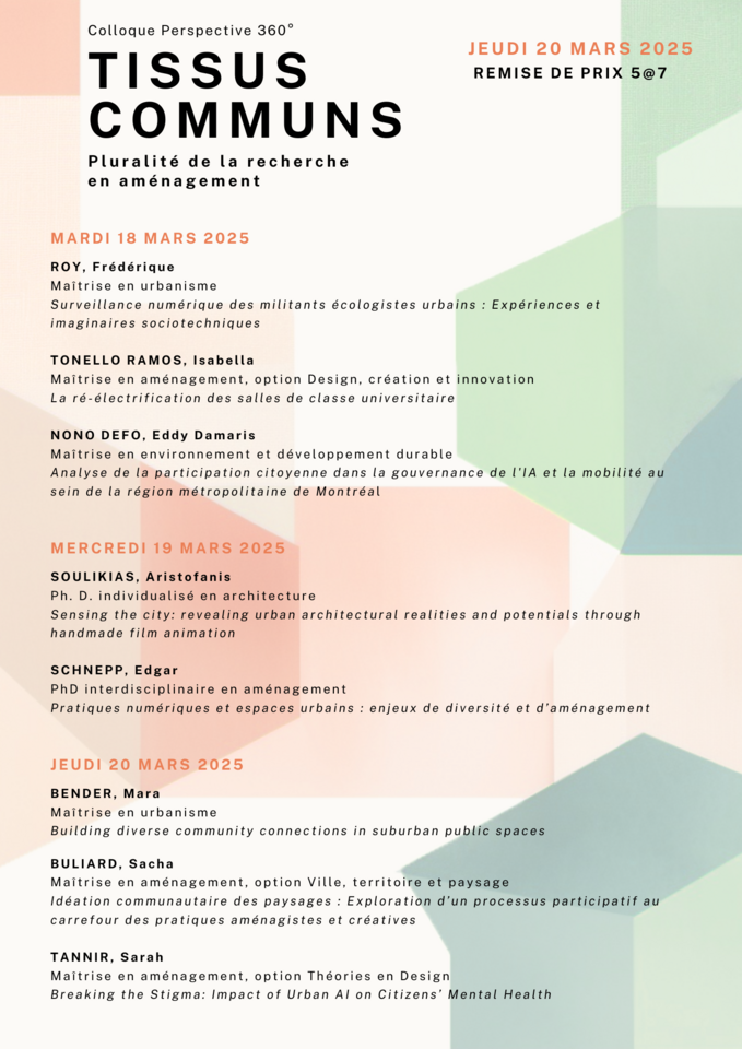 Retrouvez-nous autour de la thématique « Tissus communs : Pluralité de la recherche en aménagement » pour découvrir la recherche étudiante (de maîtrise et doctorat) dans une optique pluridisciplinaire caractéristique de la Faculté de l'Aménagement