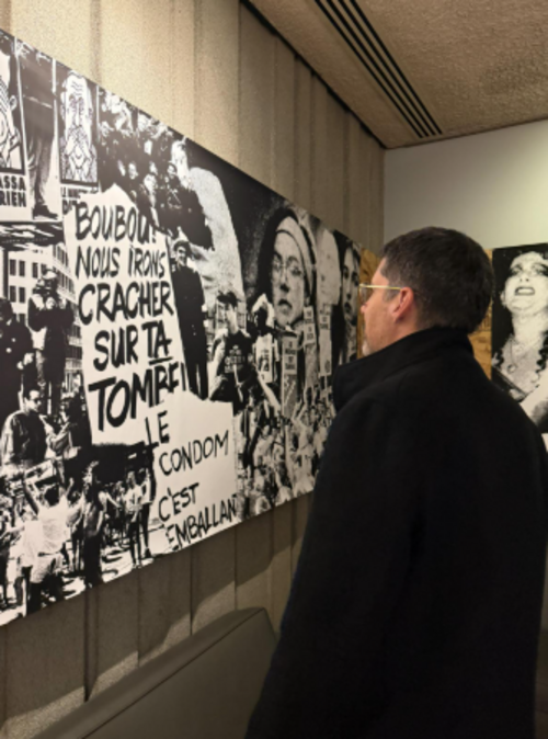 La session a commencé avec la réalisation de deux expositions conçues par des étudiantes à l’automne 2024, accompagnées par la chargée de formation pratiqué Aude Beauchamp-Bourdeau. Dans le cadre d’une collaboration entre le professeur Olivier Vallerand, la compagnie de création théâtrale La messe basse et le Théâtre Duceppe, ces deux expositions accompagnaient la pièce de théâtre Corps fantômes, portant sur l’activisme LGBTQ au tournant des années 1990, dans un contexte d’épidémie du VIH/sida, de meurtres homophobes et de répression policière. Le travail des étudiantes a permis de mettre en valeur des citations d’activistes, des photos de René LeBoeuf et de nombreuses coupures de journaux afin de bien faire comprendre le contexte de la pièce. Un très grand succès, entre autres démontré par de nombreuses photos de l’exposition circulant sur les réseaux sociaux et repartagées par le théâtre, les commentaires positifs reçus par le théâtre à propos de la transformation inédite du foyer ont donné à l’équipe le désir de renouveler l’expérience!