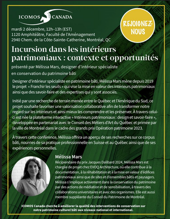 La conférence Incursion dans les intérieurs patrimoniaux: contexte et opportunités sera présentée par Mélissa Mars, lauréate du Prix Jacques Dalibard...