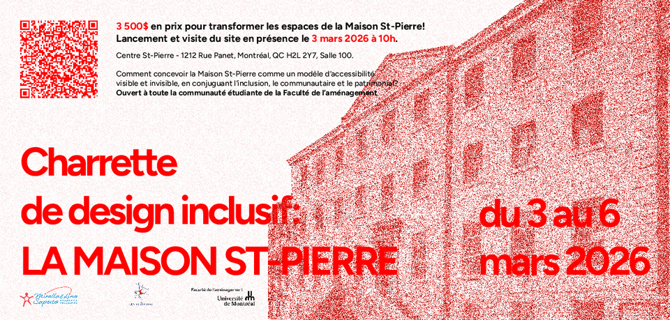 En partenariat avec le Centre St-Pierre et la Maison St-Pierre, cette charrette de design inclusif vous invite à imaginer l’accessibilité universelle, visible et invisible, au cœur d’un bâtiment patrimonial exceptionnel. Pendant quelques jours intensifs et effervescents, contribuez à un projet à fort impact social et courez la chance de remporter l’une des trois bourses totalisant 3 500 $.