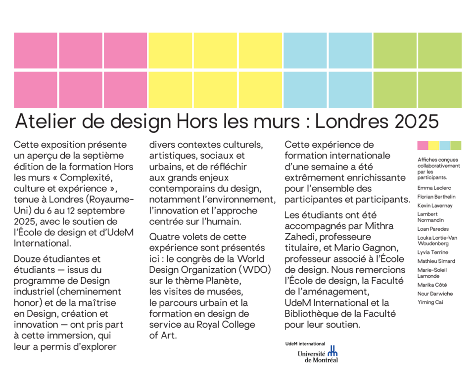 Cette exposition présente un aperçu des réflexions issues de la septième édition de la formation internationale Hors les murs, réunissant douze étudiantes et étudiants de l’École de design. À travers une immersion à Londres, ils ont exploré des enjeux contemporains liés à l’environnement, à l’innovation, à l’approche centrée sur l’humain et aux transformations culturelles et urbaines.