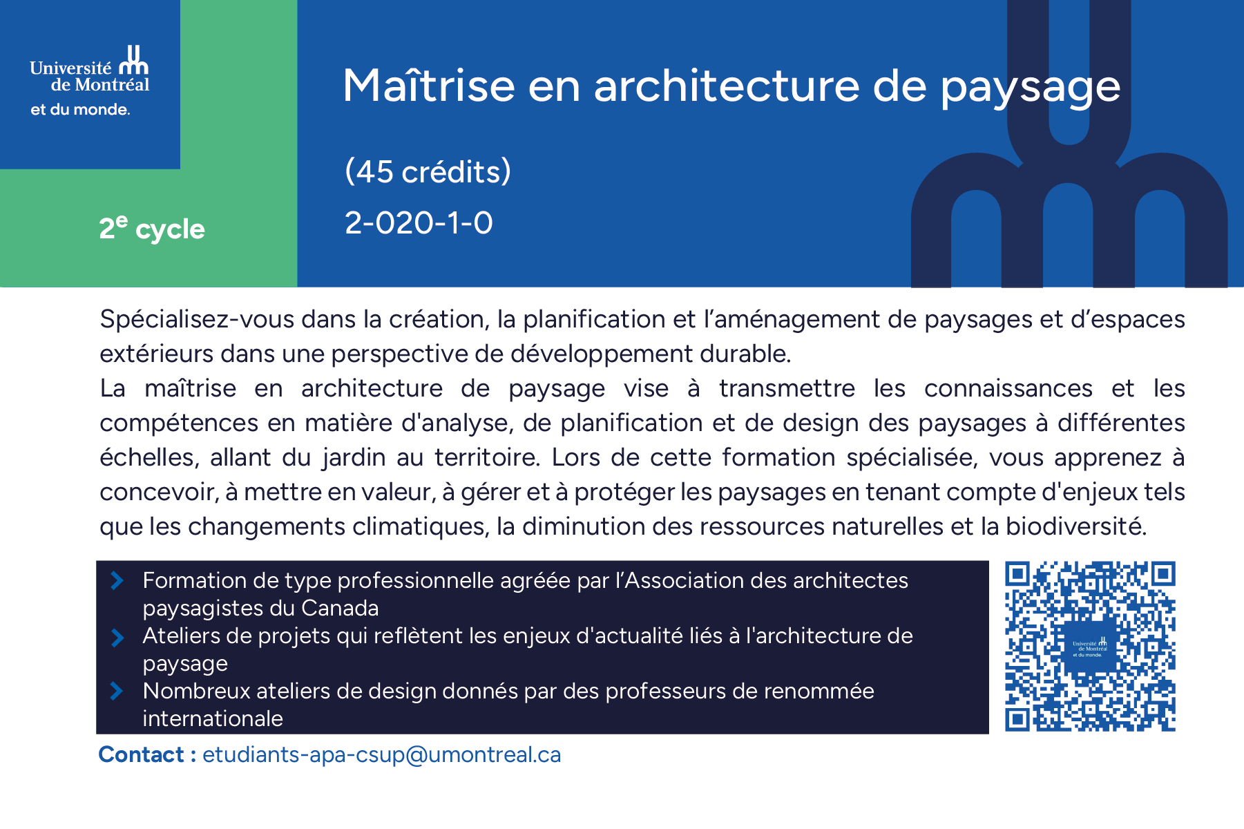 La maîtrise en architecture de paysage est un programme professionnel d’approfondissement des connaissances en matière de planification et d’aménagement d’espaces extérieurs, de paysages et de territoires à différentes échelles.